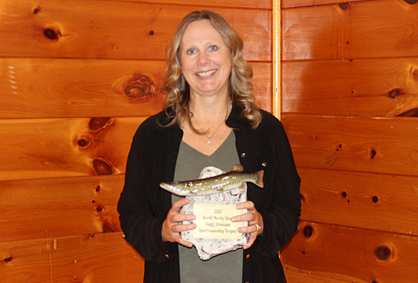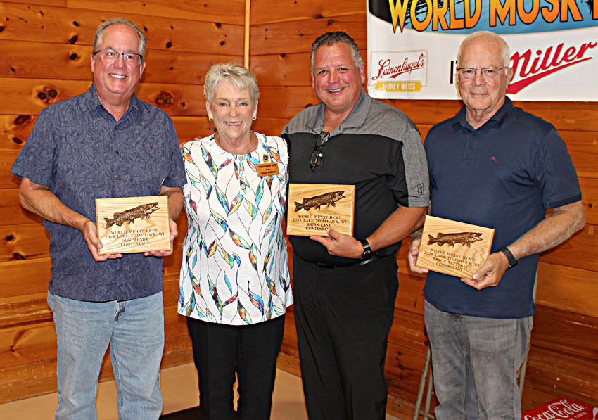 2025 Peggy  Driessen Sportsmanship Award Winner Jodi Long 2025 WMH Honorary Guide Jim Stewart 2025 Dave Doolittle Past Hunter Award winner Matt Scriver Larry Slagoski receives World Musky Hunt/ Musky Alliance of Wisconsin Award commemorating his contribution to the sport of musky fishing