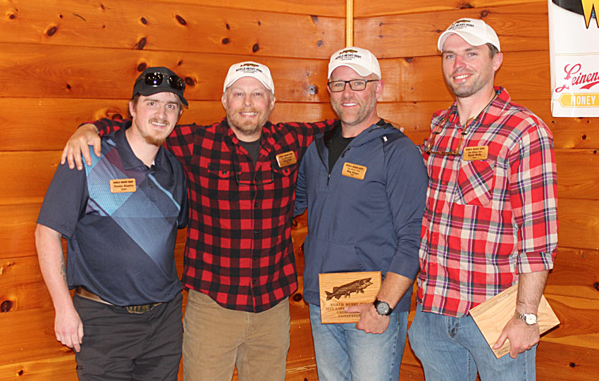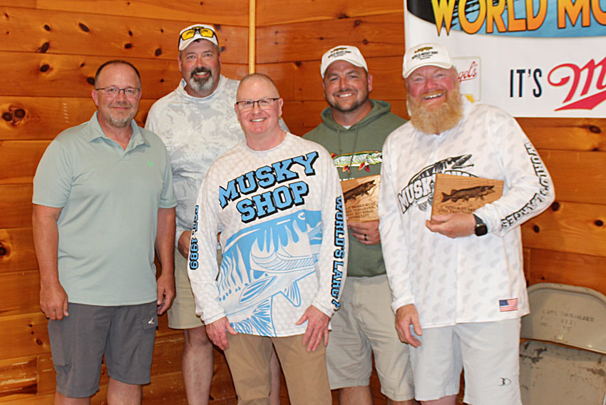 2025 World Musky Hunt Board of  Directors 2025 Past Hunter Award winner John Maurin shown here with guide Tim Cerny 2025 WMH Dead Fish Award Winner Chuck Brod 2025 Top Past Hunter Guide Award Winner Jason Long shown here with WMH Board Member Jeff Micholic