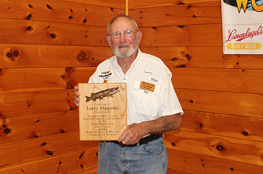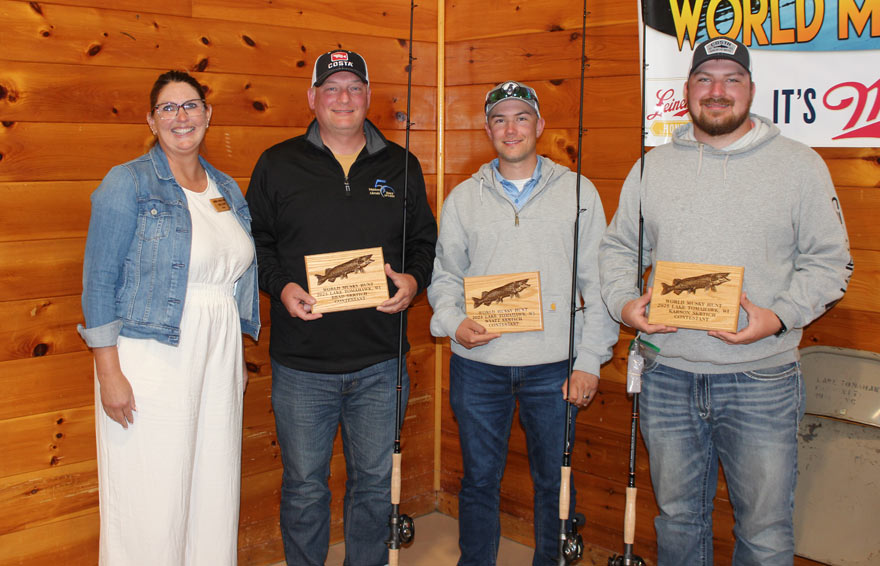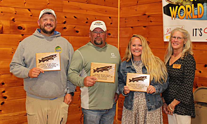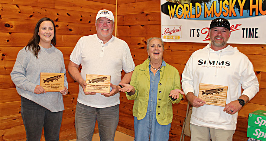 2025 Peggy  Driessen Sportsmanship Award Winner Jodi Long 2025 WMH Honorary Guide Jim Stewart 2025 Dave Doolittle Past Hunter Award winner Matt Scriver Larry Slagoski receives World Musky Hunt/ Musky Alliance of Wisconsin Award commemorating his contribution to the sport of musky fishing
